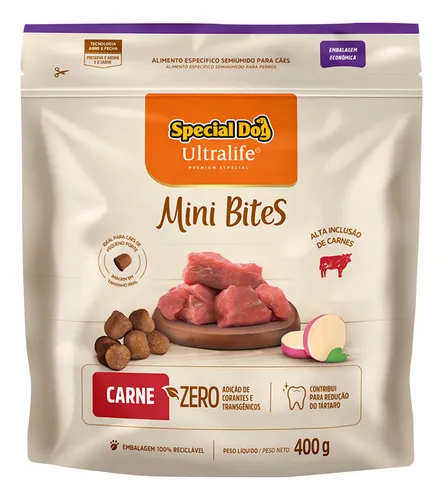 Special Dog Ultralife Mini Bites foi elaborada por veterinários, não contém corantes, contribui para a redução de tártaro e foi desenvolvida com mais de 70% de carne.