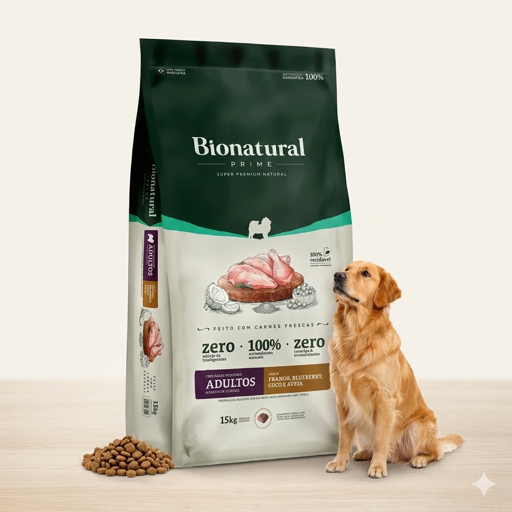 A linha Super Premium Natural da Bionatural é formulada sem corantes artificiais e com conservantes naturais (vitamina E/tocoferois). Verifique a lista de ingredientes na embalagem para detalhes completos do lote.
