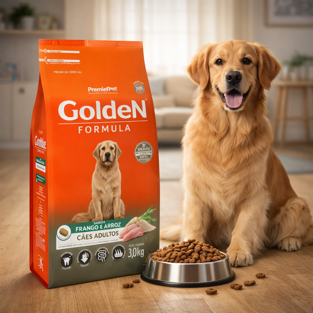 A Ração Golden Fórmula para Cães Adultos Sabor Frango e Arroz é “O Frango Premiado com Digestão Leve” — ração Fórmula da Golden formulada especificamente para cães adultos de todas as raças. Com 28% de proteína bruta e 12% de gordura, entrega energia precisa, musculatura firme e pelagem brilhante em todas as fases da vida adulta.