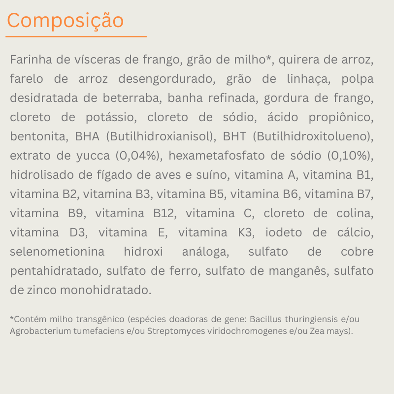 - Frango como primeiro ingrediente + arroz: Combinação de alta digestibilidade — frango para proteína de qualidade, arroz para energia de liberação gradual sem fermentação intestinal.
