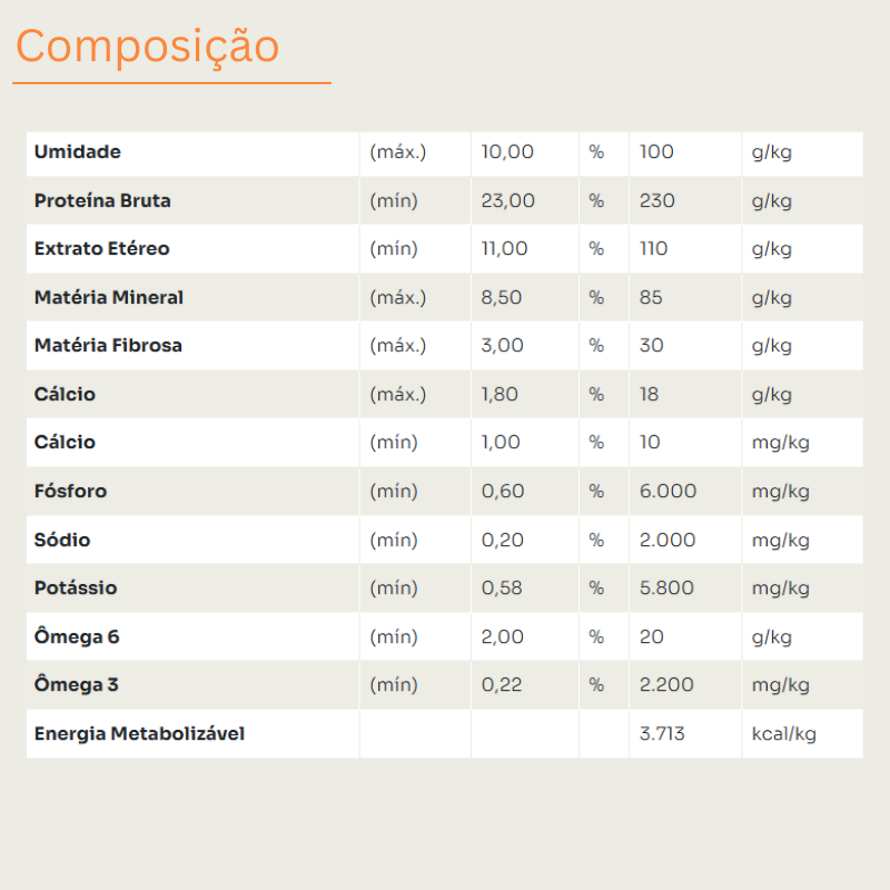 Mantenha a ração no saco original fechado ou em recipiente hermético, em local seco e arejado, longe do sol direto e de umidade. Após abrir, consuma em até 30–45 dias para preservar a palatabilidade, os óleos e as vitaminas. Não misture ração nova com resíduos da embalagem antiga.