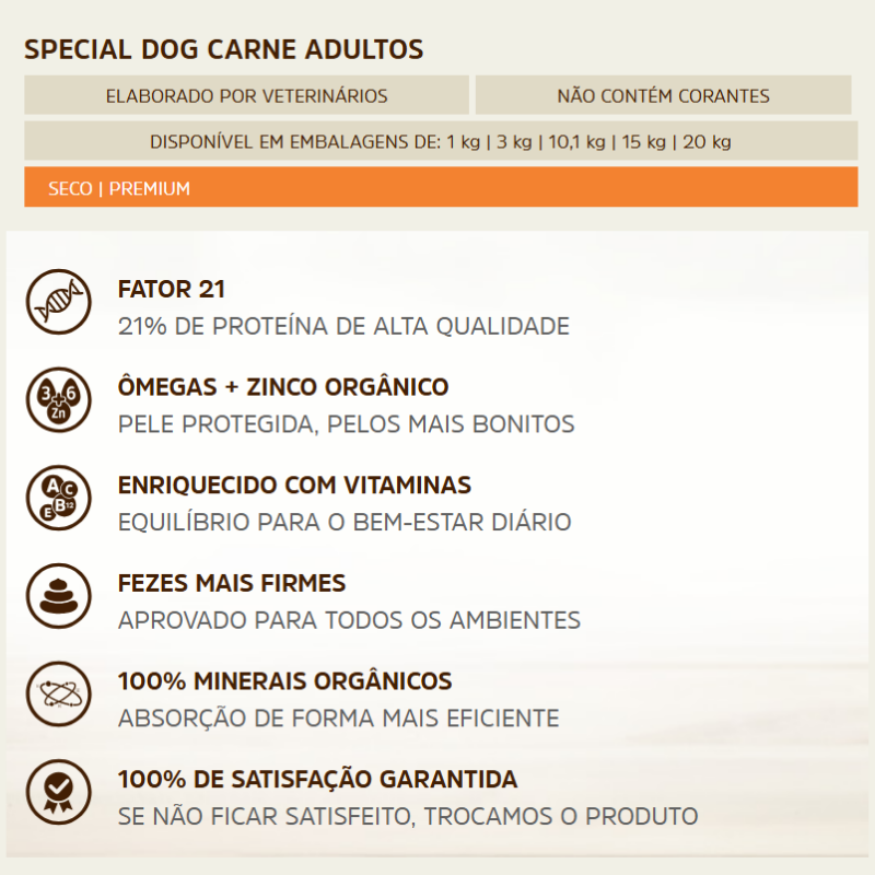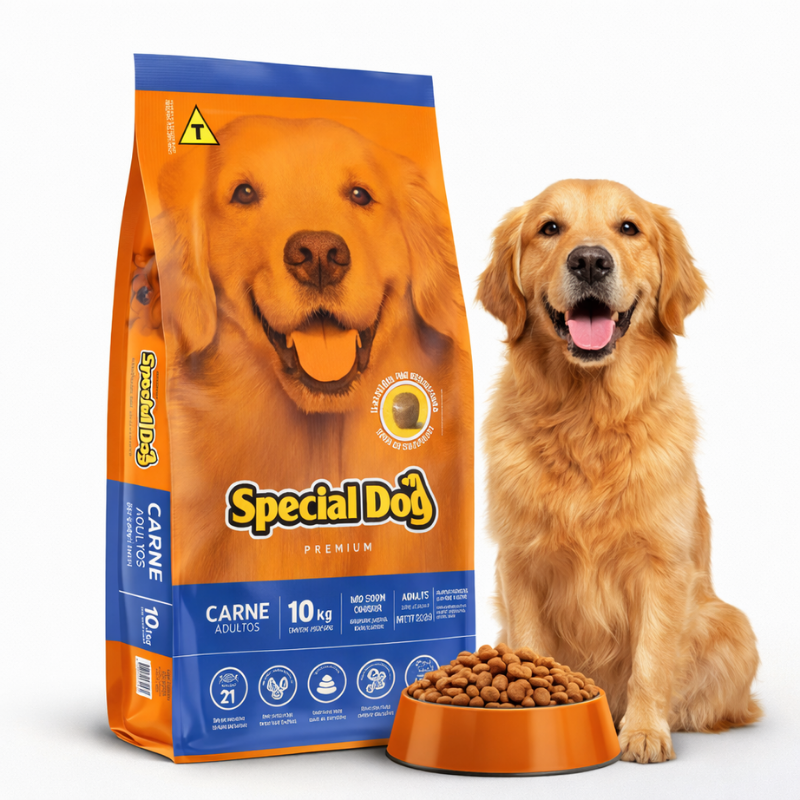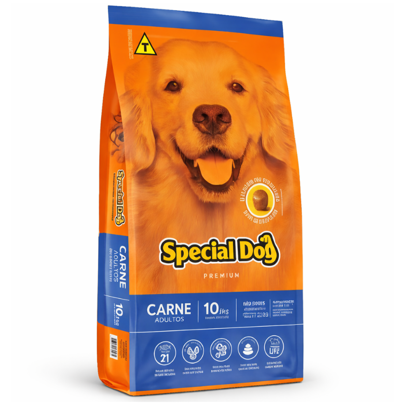 A Ração Special Dog Premium para Cães Adultos Sabor Carne é “O Custo-Benefício Confiável” — ração Premium da Special Dog formulada especificamente para cães adultos de todas as raças. Com 24% de proteína bruta e 10% de gordura, entrega energia precisa, musculatura firme e pelagem brilhante em todas as fases da vida adulta.