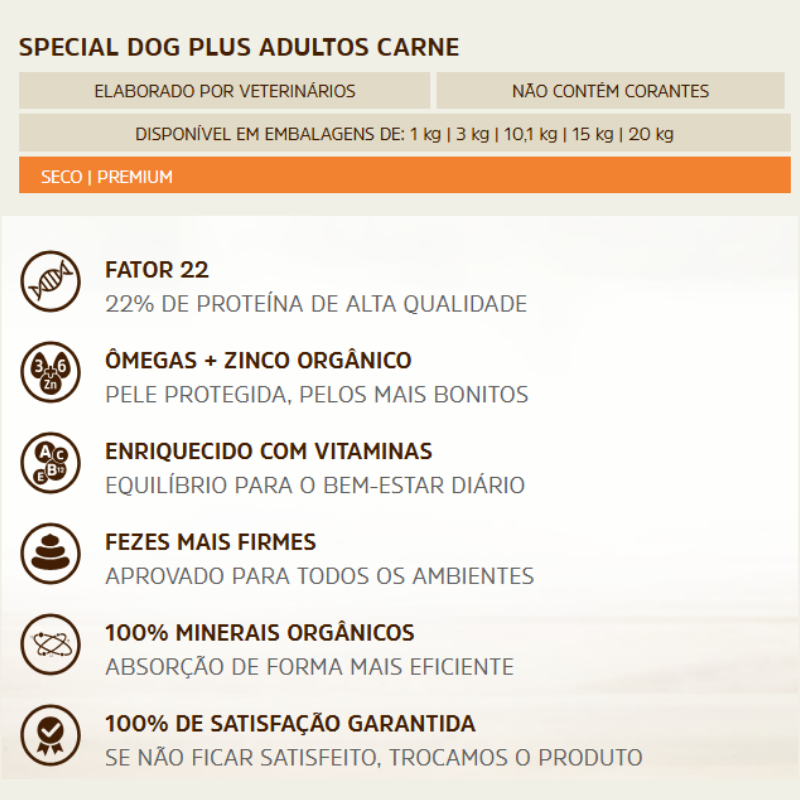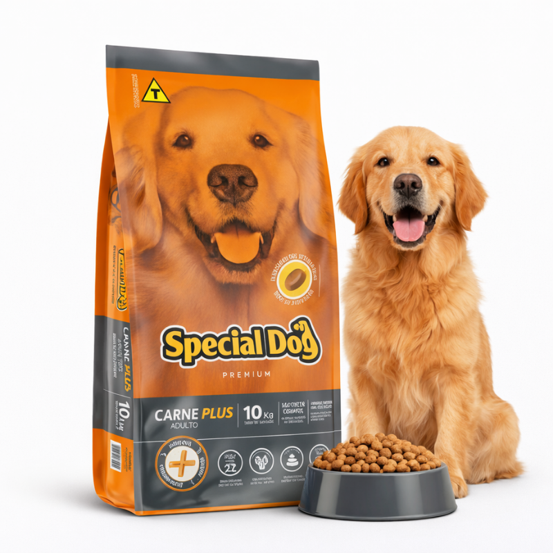 A Ração Special Dog Plus para Cães Adultos Sabor Carne é “O Plus de Nutrição no Dia a Dia” — ração Plus da Special Dog formulada especificamente para cães adultos de todas as raças. Com 25% de proteína bruta e 10% de gordura, entrega energia precisa, musculatura firme e pelagem brilhante em todas as fases da vida adulta.
