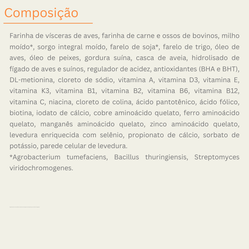 - 25% proteína — nível acima da linha Premium básica: Inclusão proteica ligeiramente superior garante mais sustentação muscular sem elevar significativamente o custo diário.