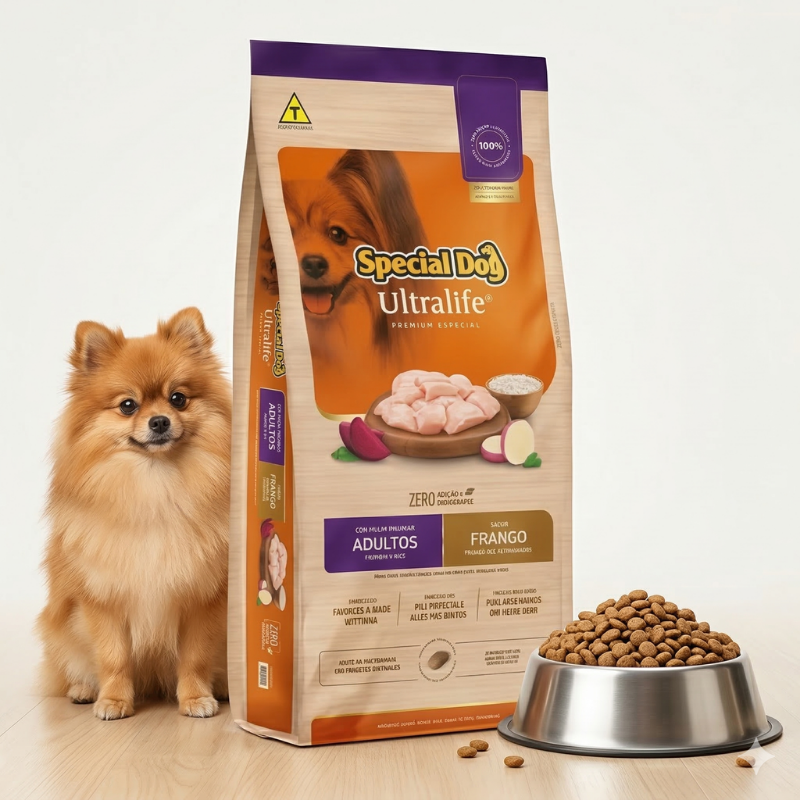 A Ração Special Dog Ultralife para Cães Adultos Raças Pequenas Sabor Frango é “O Frango Premiado para Raças Pequenas” — ração Ultralife da Special Dog formulada especificamente para cães adultos de raças pequenas. Com 30% de proteína bruta e 14% de gordura, entrega energia precisa, musculatura firme e pelagem brilhante em todas as fases da vida adulta.