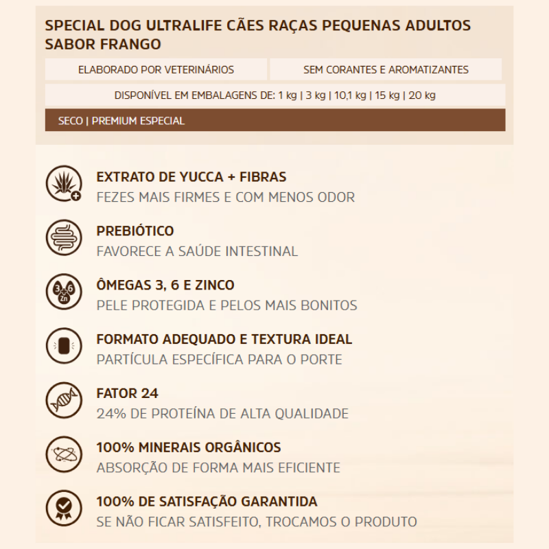 Diferenciais da Ração Special Dog Ultralife para Cães Adultos Raças Pequenas Sabor Frango