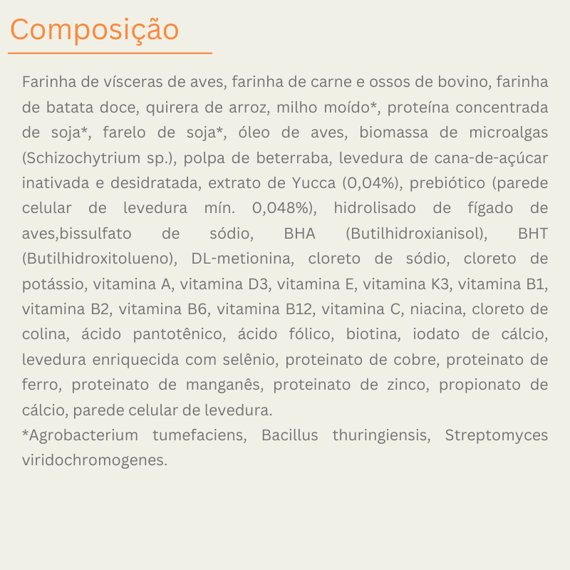 - Prebióticos digestivos: FOS e MOS que equilibram a microbiota — digestão eficiente e fezes firmes.