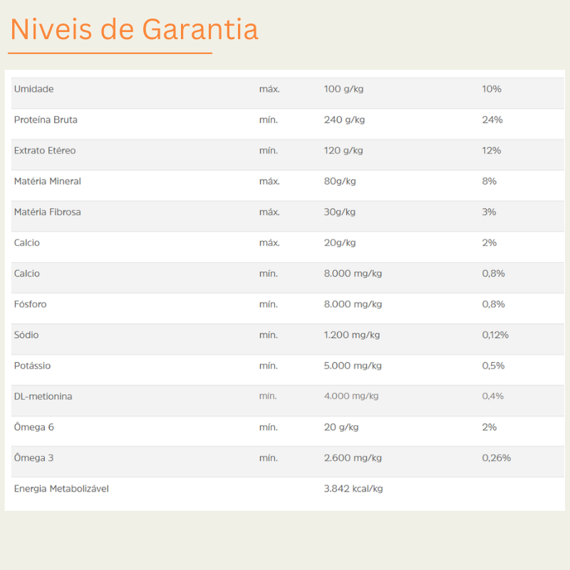 Mantenha a ração no saco original fechado ou em recipiente hermético, em local seco e arejado, longe do sol direto e de umidade. Após abrir, consuma em até 30–45 dias para preservar a palatabilidade, os óleos e as vitaminas. Não misture ração nova com resíduos da embalagem antiga.