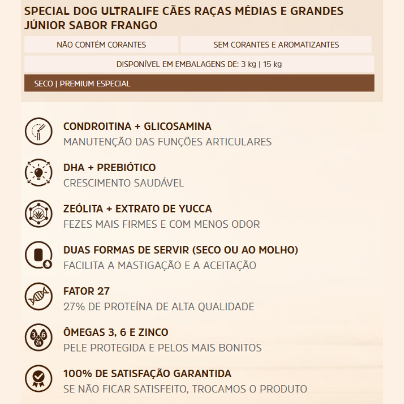 Diferenciais da Ração Special Dog Ultralife Junior para Cães Filhotes Raças Médias e Grandes Sabor Frango
