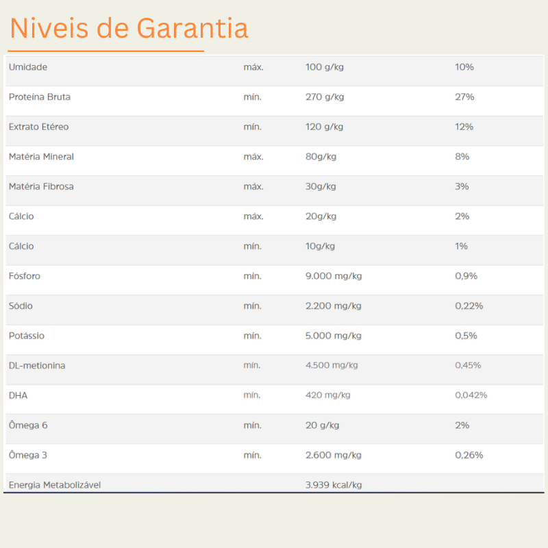 Mantenha a ração no saco original fechado ou em recipiente hermético, em local seco e arejado, longe do sol direto e de umidade. Após abrir, consuma em até 30–45 dias para preservar a palatabilidade, os óleos e as vitaminas. Não misture ração nova com resíduos da embalagem antiga.