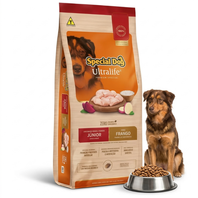 A Ração Special Dog Ultralife Junior para Cães Filhotes Raças Médias e Grandes Sabor Frango é “O Super Premium do Crescimento” — ração Ultralife Junior da Special Dog formulada especificamente para cães filhotes de raças médias e grandes. Com 32% de proteína bruta e 14% de gordura, entrega energia precisa, musculatura firme e pelagem brilhante em todas as fases da vida adulta.