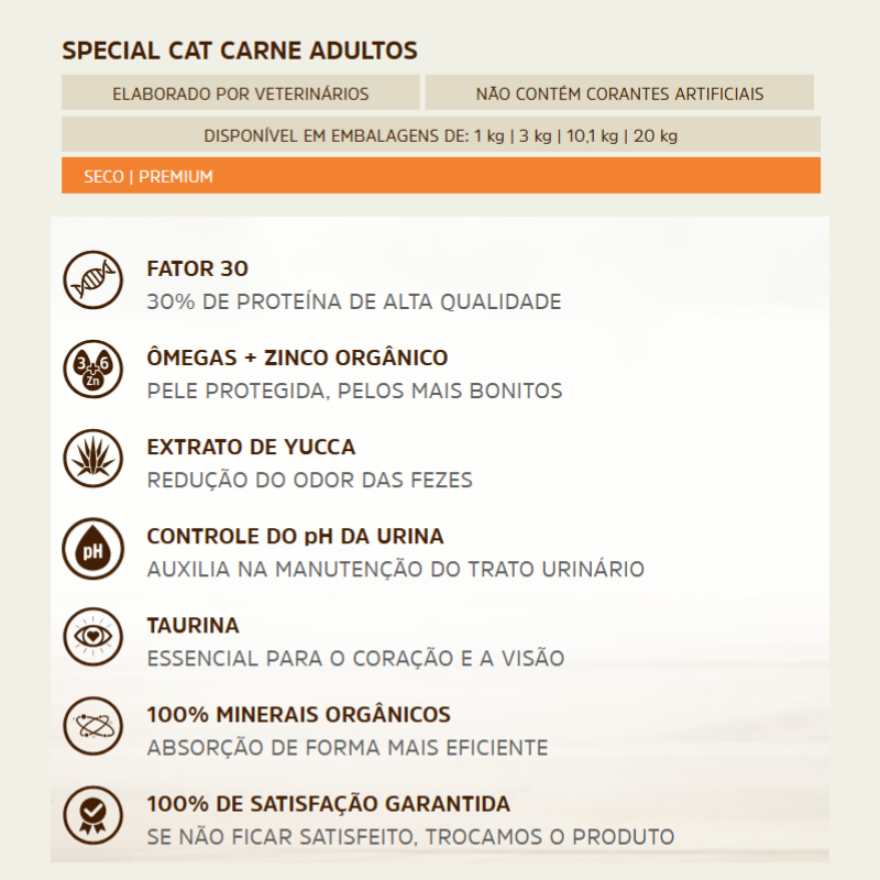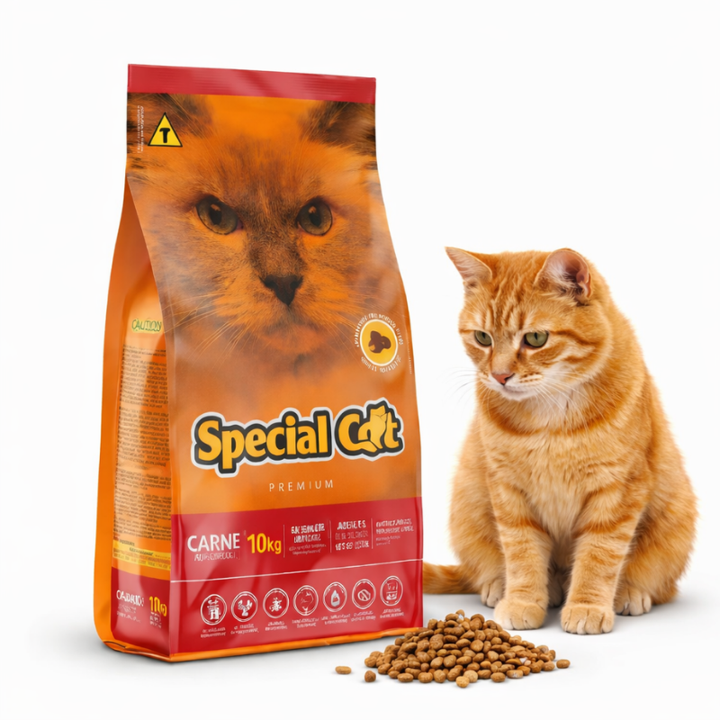 A Ração Special Cat Premium para Gatos Adultos Sabor Carne – 10,1 kg é “A Clássica dos Felinos” — ração Premium da Special Cat formulada para gatos adultos, com 30% de proteína bruta e sabor Carne. Os felinos são carnívoros obrigatórios — precisam de ração com alta proteína animal, taurina e arginina que a dieta natural (presas) fornece e que a ração premium reproduz com precisão.