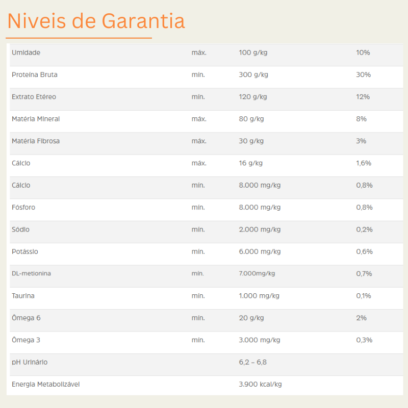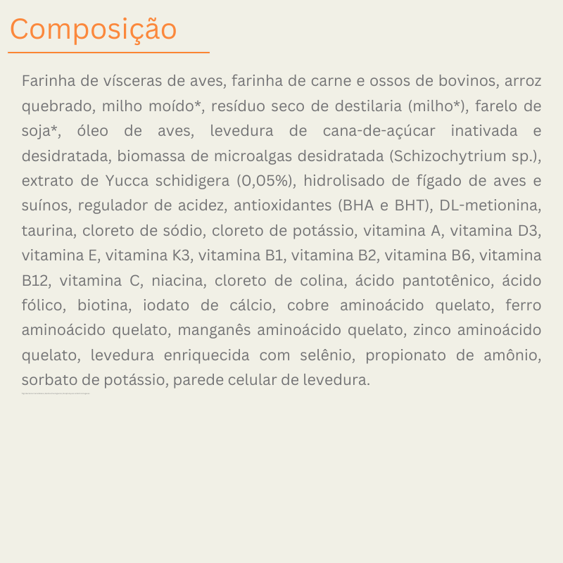 - Niacina de origem animal: Gatos não sintetizam niacina suficiente — a ração premium garante o suprimento via proteína animal de qualidade.