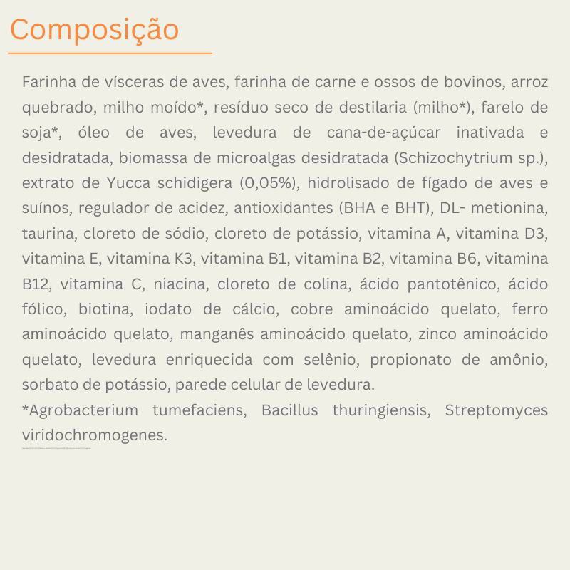 - Taurina, arginina e metionina: Os três aminoácidos mais críticos para felinos — presentes na quantidade certa para saúde cardíaca, renal e imunológica.