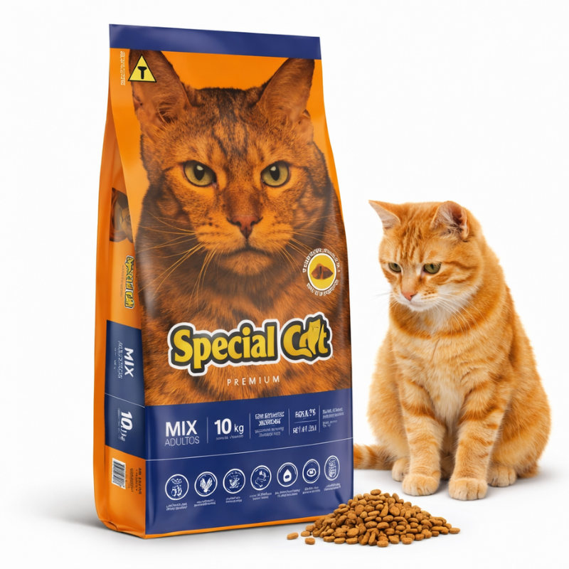 A Ração Special Cat Premium para Gatos Adultos Sabor Mix – 10,1 kg é “A Variedade Premiada no Prato” — ração Premium da Special Cat formulada para gatos adultos, com 30% de proteína bruta e sabor Mix (Carne, Frango e Peixe). Os felinos são carnívoros obrigatórios — precisam de ração com alta proteína animal, taurina e arginina que a dieta natural (presas) fornece e que a ração premium reproduz com precisão.