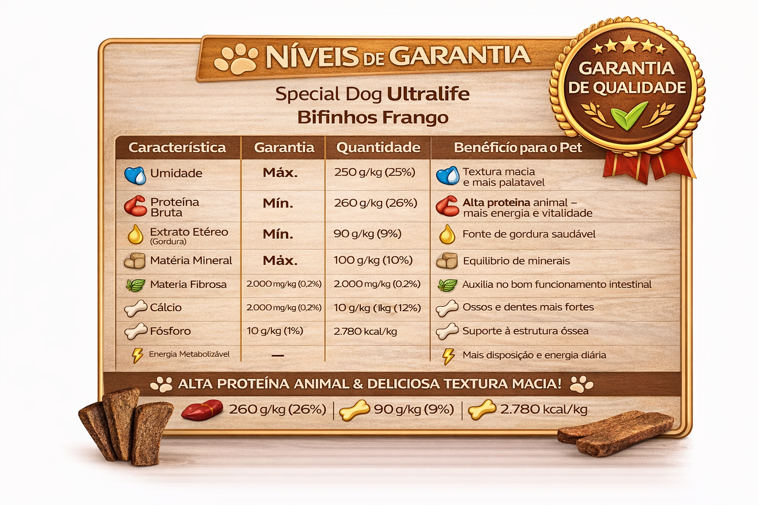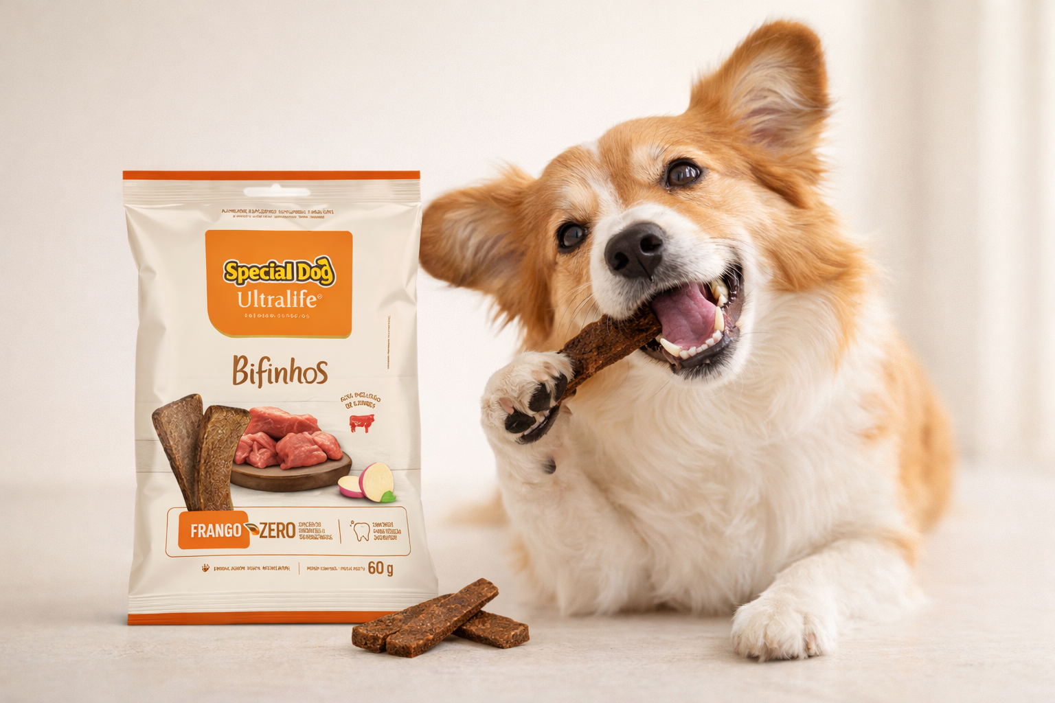 Nota de Posicionamento: Os petiscos Bifinhos e Mini Bites são o complemento ideal às rações Special Dog Ultralife — use como recompensa no treinamento positivo, como mimo diário ou para facilitar a administração de medicamentos. A palatabilidade elevada garante que o cão aceite sem hesitação.